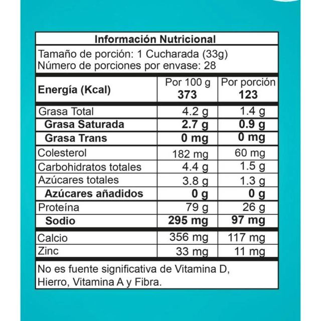 Proteína concentrada y aislada de suero, saborizante natural, dióxido de silicio, goma xantana, lecitina de soya, lactasa, zinc, stevia, vitamina B6.