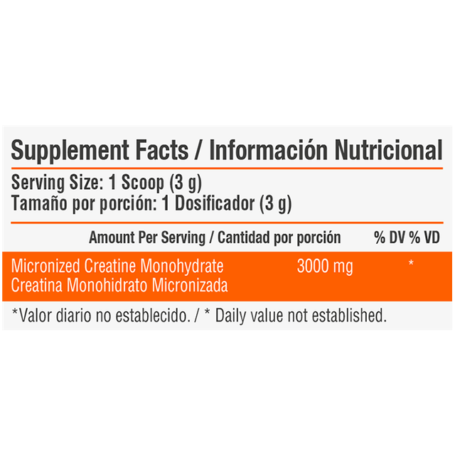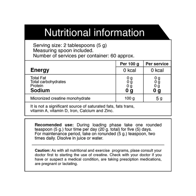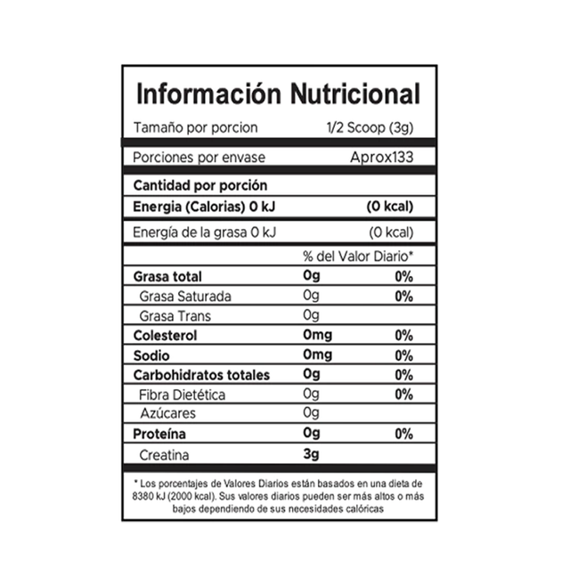 Contiene 5 gramos de monohidrato de creatina de alta calidad por porción