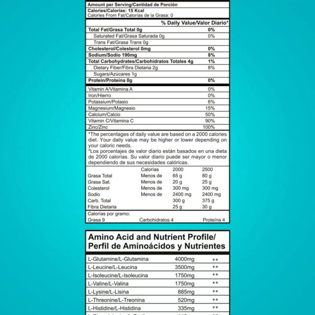 Fórmula avanzada de BCAA y L-Glutamina de rápida absorción. Los BCAA se transforman en energía durante la actividad física y la L-Glutamina constituye el 60% de la masa muscular.