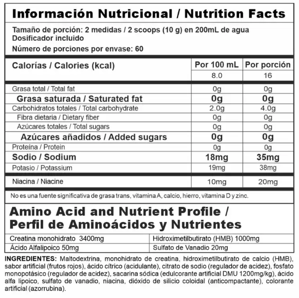 Es la última generación en suplementación, fórmula única que incluye HMB, ácido Alfa Lipoico y Sulfato de Vanadio, ideal para alcanzar tus objetivos con mayor facilidad.
