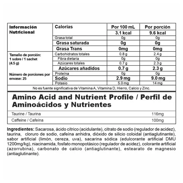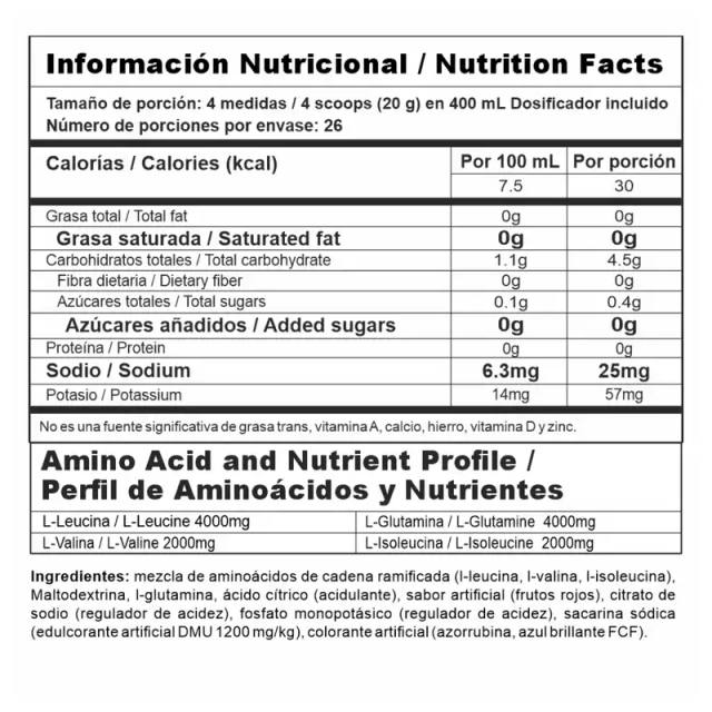 Fórmula avanzada de aminoácidos para mejorar rendimiento y resistencia. Incluye BCAA (leucina, isoleucina, valina) esenciales para la síntesis de proteínas.