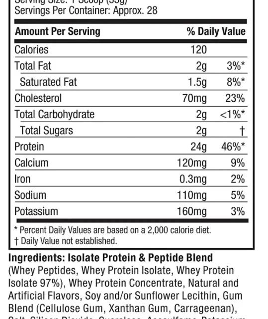 Combina suero de leche puro, péptidos de suero y aislados de proteína. Cada porción de 33g ofrece 24g de proteína, 5.4g de BCAAs, 4g de glutamina y 2g de azúcar. Libre de gluten. Contenido: 2 lbs.