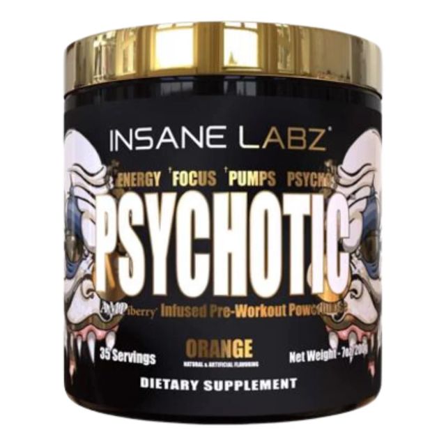 Psychotic Pre Workout Orange 217 gr de Insane Labz es un pre entrenamiento en polvo adicionado con el ingrediente Ampiberr.